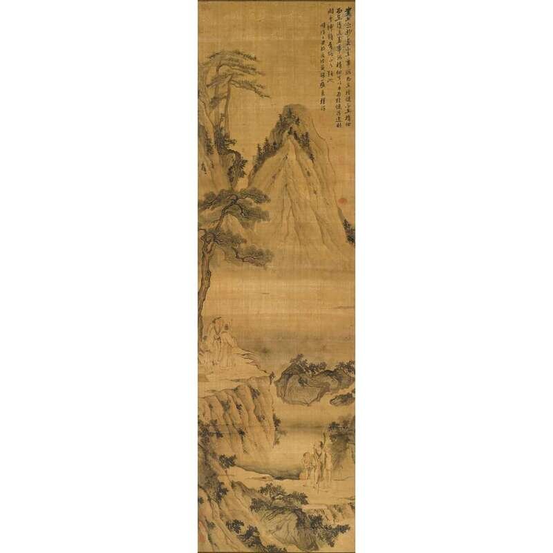Hanging scroll, ink and color on silk, inscripted with a poem and two seals of the artist, three collector seals Sight H: 63 in., 160 cm, W: 18.5 in., 47cm