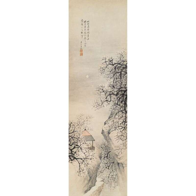 Hanging scroll, ink and color on paper, inscriped and signed by the arist, with two seals. Sight H: 42 in.,107 cm, W:13 in.,33 cm