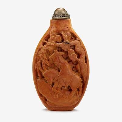 A Chinese carved brown skin wood snuff bottle