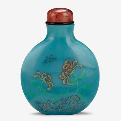 A Chinese enameled blue glass snuff bottle decorated with chrysanthemums gu yuexuan mark