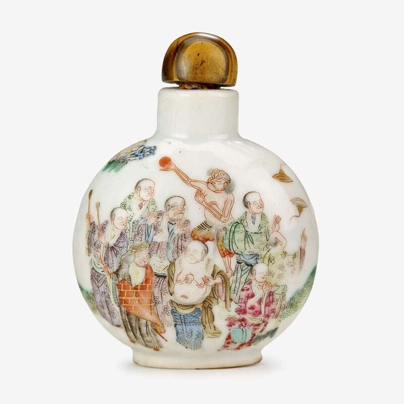 A Chinese famille rose enameled porcelain Luohan snuff bottle with tiger eye stopper daoguang four character mark and of the period