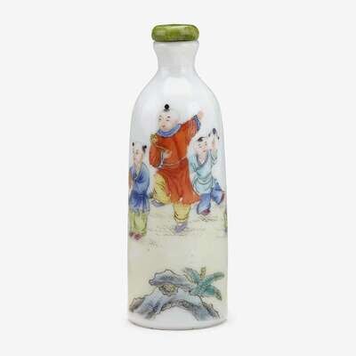 A Chinese porcelain famille rose snuff bottle showing children at play Hongxian four character mark to base