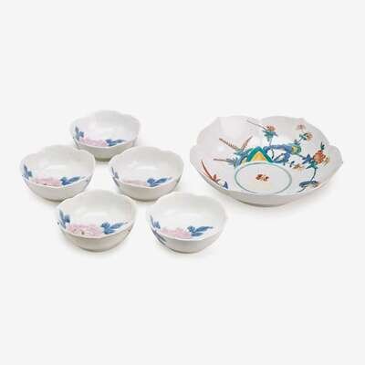 A set of five Japanese glazed porcelain floral rimmed bowls with a larger floral rimmed dish meiji period