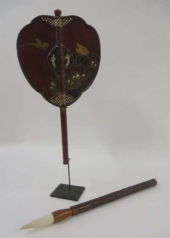 A Japanese carved boxwood calligraphy brush with a lacquered Japanese war fan inset with mother of pearl meiji period