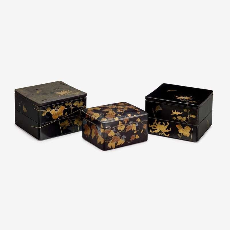 A Japanese gilt painted lacquer covered box, together with two gilt lacquered two-tier boxes 19th/20th century