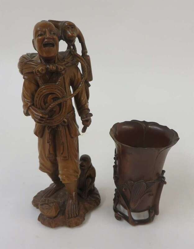Two Japanese boxwood carvings: a magnolia formed cup and an okimono of a monkey trainer meiji period
