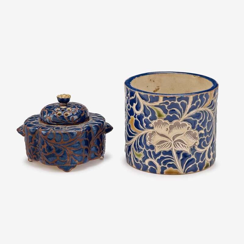 A Japanese glazed earthenware censer and similarly decorated brush pot 19th / 20th century