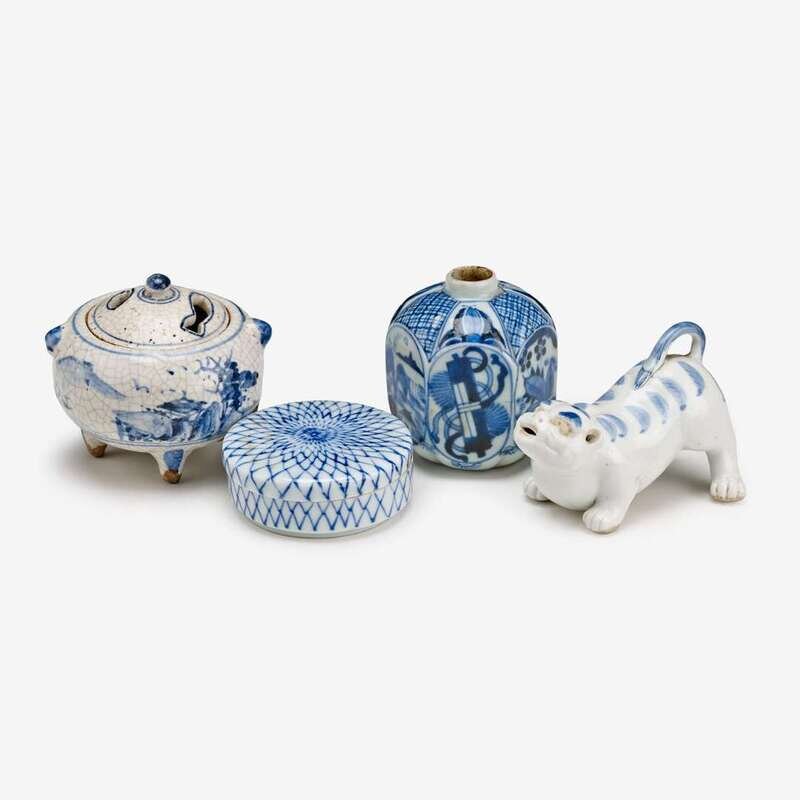 Three small Japanese blue and white glazed porcelain covered jars with one blue and white glaze porcelain tiger shaped water dropper 19th century