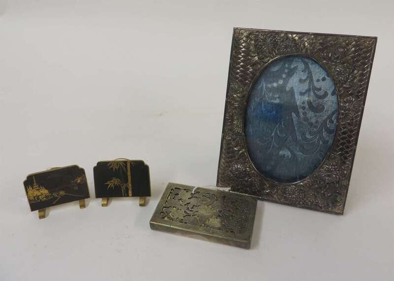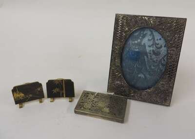 A Japanese silver and gilt kogo medicine box, together with a silver picture frame and a pair of gilt card holders