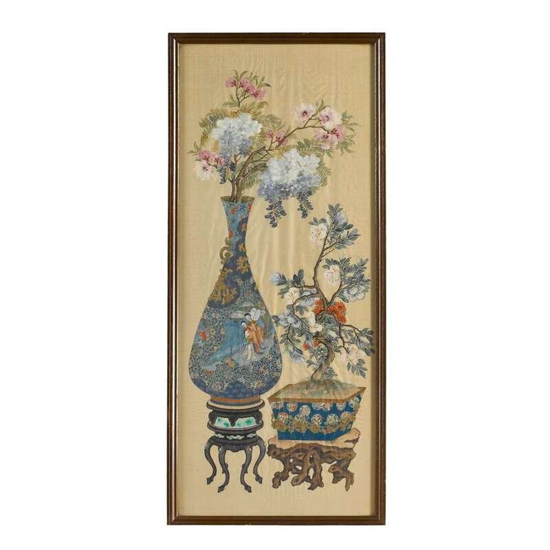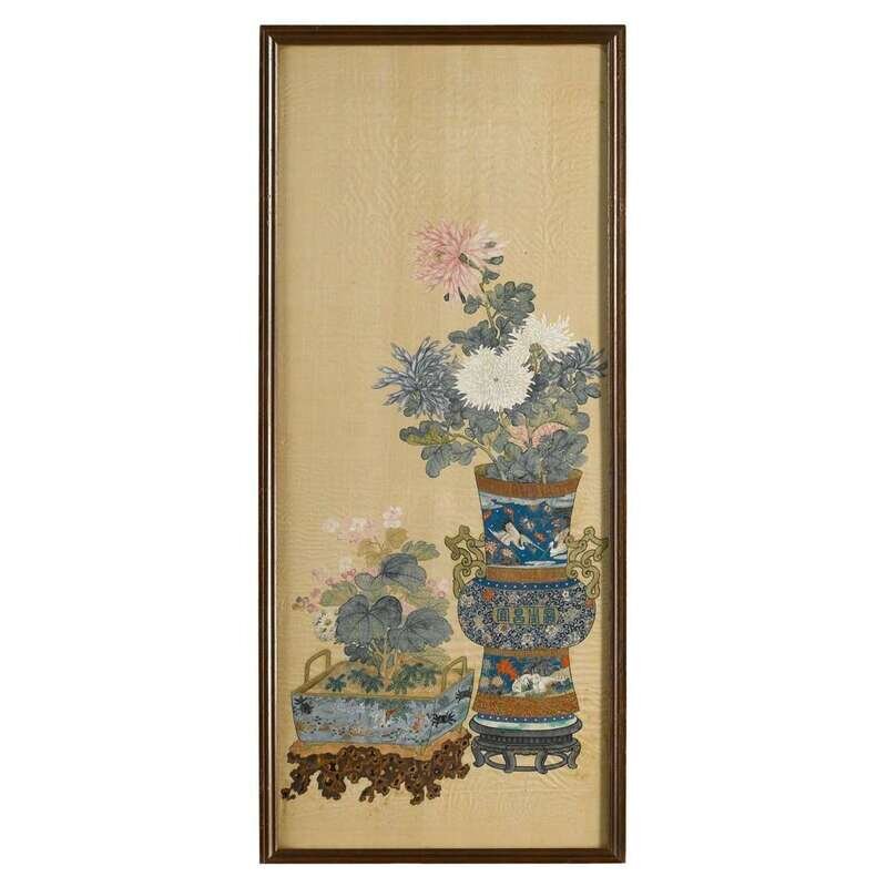 Two Chinese painted silk panels showing still lifes of flowers in porcelain and cloisonné vessels late qing dynasty