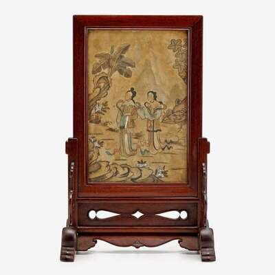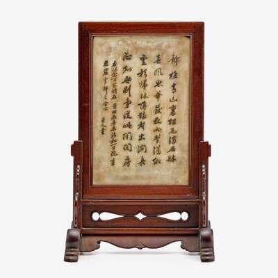 A Chinese painted stone table screen with rosewood stand signed and dated 1811