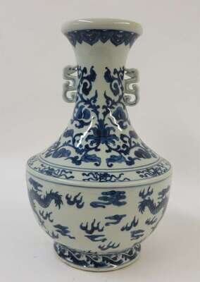 A Chinese blue and white glazed porcelain twin handled baluster vase 20th century
