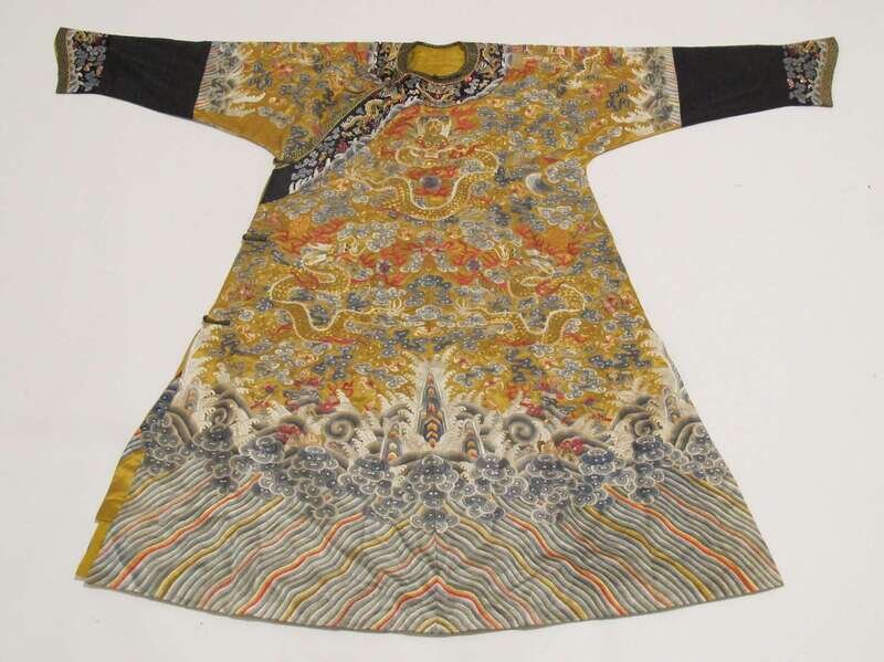 A Chinese embroidered yellow ground silk dragon robe 20th century