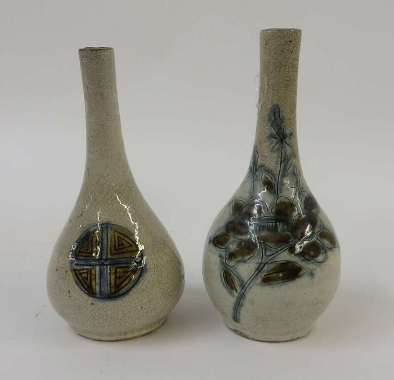 A pair of small Japanese Ryukyu island crackle glazed sake bottles 19th century