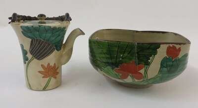 consisting of a square shaped bowl and baluster form tea pot.
