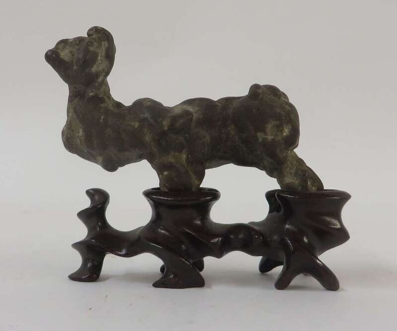 A Chinese small Lingbi figure of a mythical beast over wooden stand qing dynasty