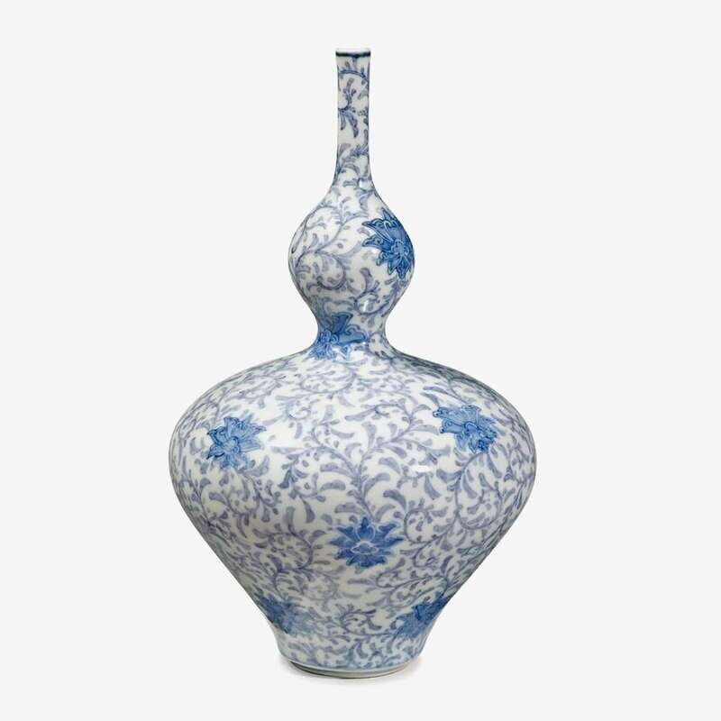A fine Japanese double gourd form blue and white glazed porcelain bottle signed makuzu kozan, meiji period