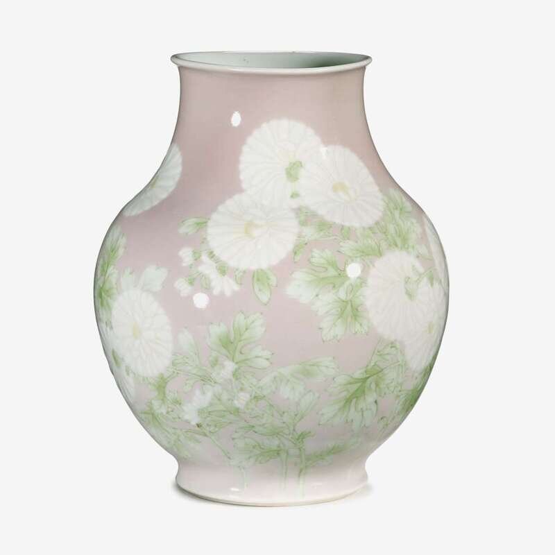 A fine Japanese baluster formed pink glaze 'chrysanthemum' porcelain vase signed makuzu kozan, meiji period