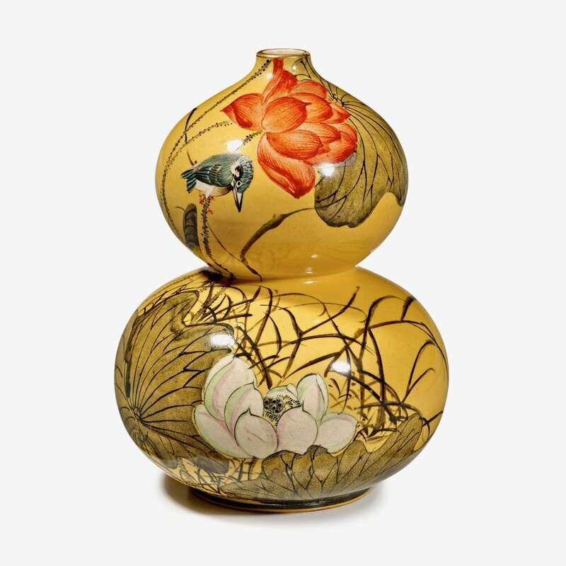 A Japanese enameled yellow ground double gourd vase signed taizan, meiji period