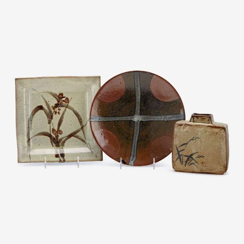 Three Japanese glazed earthenware vessels attributed to hamada shoji, 20th century