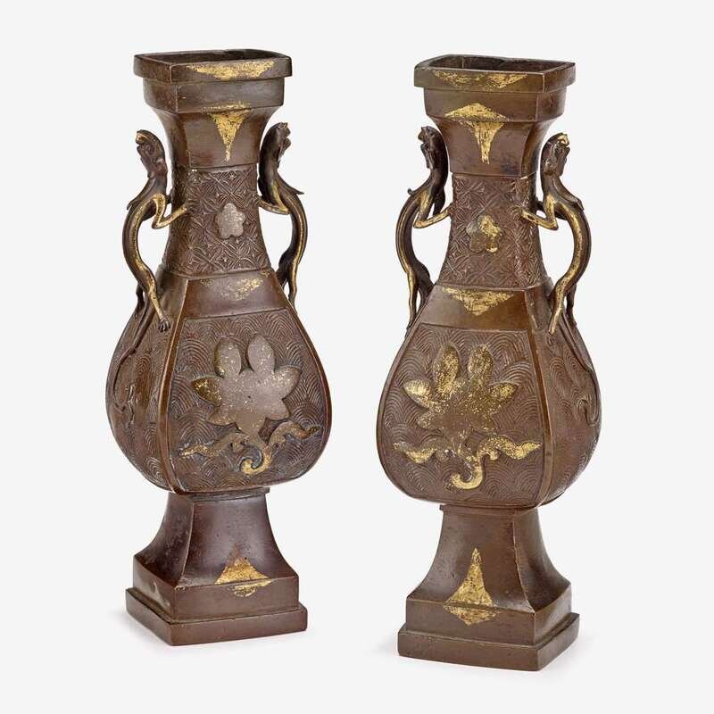 A pair of Chinese rectangular bronze baluster form incense holders with twin chilong handle early qing dynasty