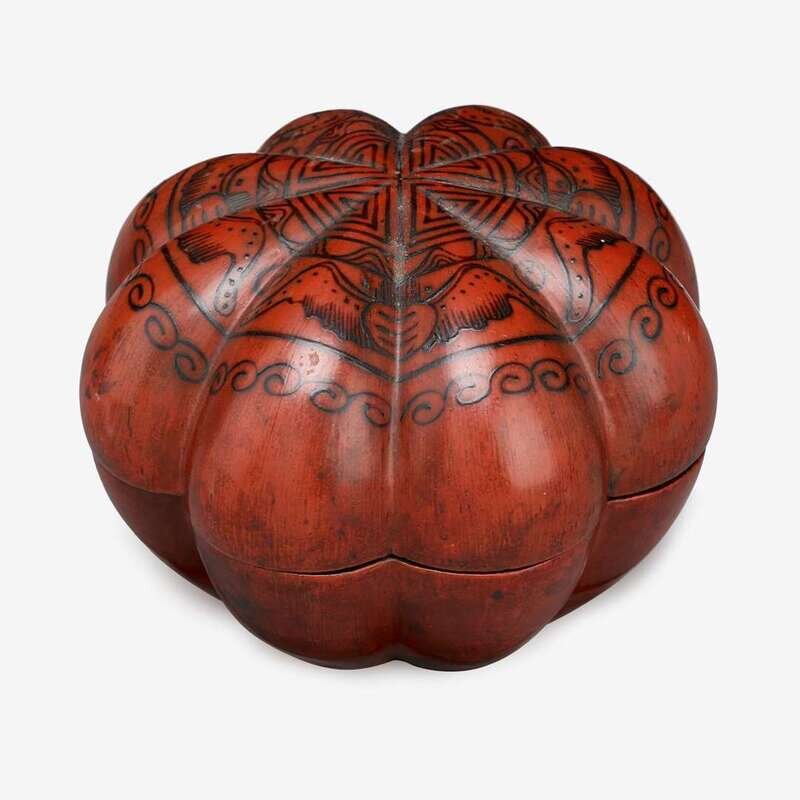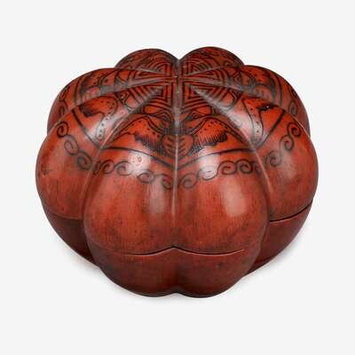 A large Chinese lacquer melon form box painted with four fu bats qing dynasty