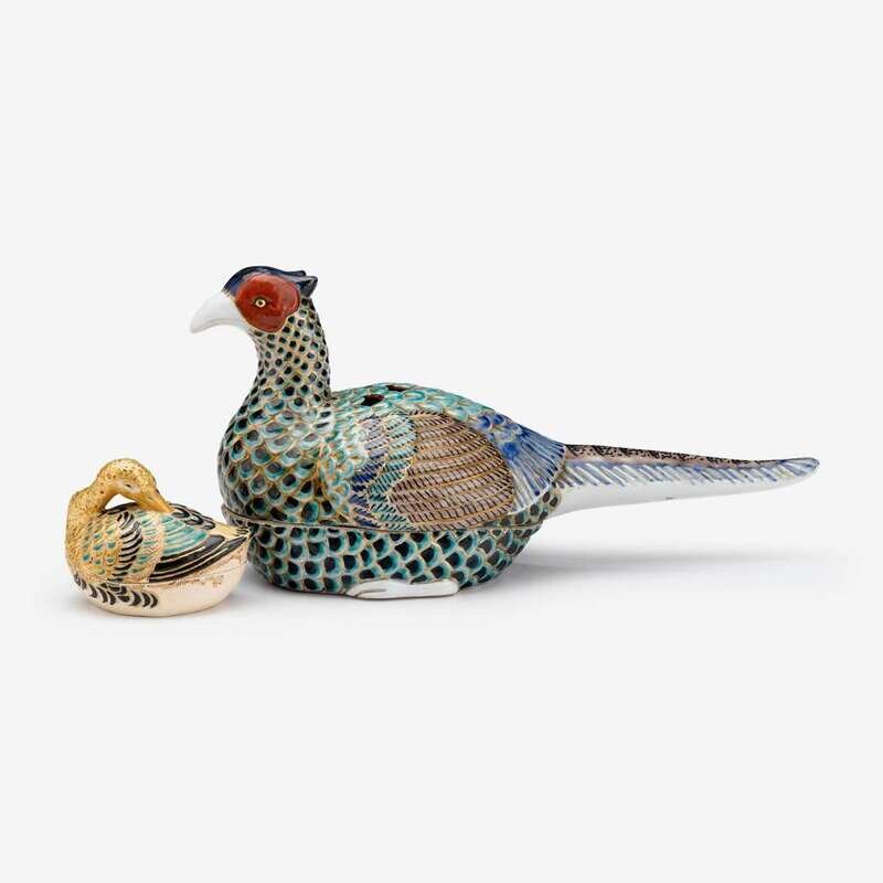 A Japanese gilt and polychrome enameled porcelain pheasant form censer and a similarly decorated duck form Satsuma kogo edo period