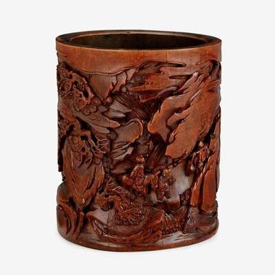 A carved Chinese cylindrical bamboo brush pot after wang yun