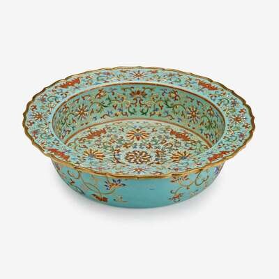 A Chinese turquoise ground famille rose and gilt porcelain basin with barbed rim jiaqing period