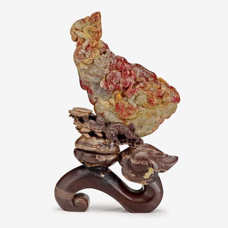 A Chinese 'chicken-blood' stone carving depicting chilong and bats signed chen weimiao