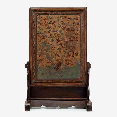 A large Chinese painted lacquer table screen showing flying dragons among clouds qing dynasty