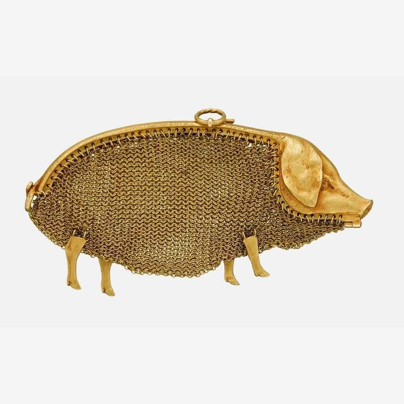 designed as a pig with a mesh purse body, detailed face, articulated legs and coiled tail; French assay marks and numbered 636 (partially obscured).