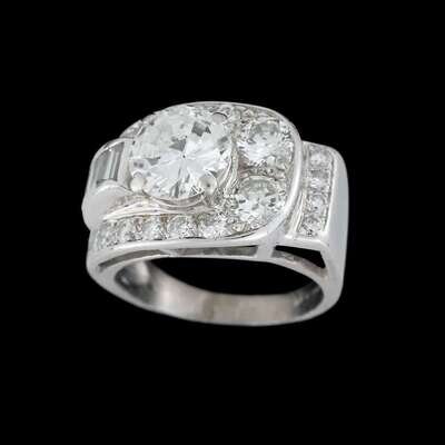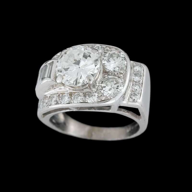 centering a round brilliant-cut diamond weighing approximately: 1.75 carats; accented by baguette, full and round brilliant-cut diamonds; total remaining diamond weight approximately: 2.00 carats.