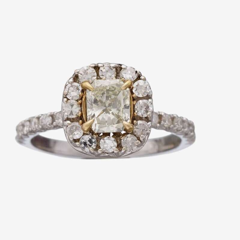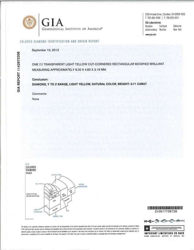 centering a radiant-cut yellow diamond weighing: 0.71 carat; accented by single and round brilliant-cut diamonds.