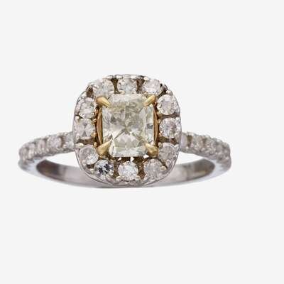 A yellow diamond, diamond and eighteen karat white gold ring