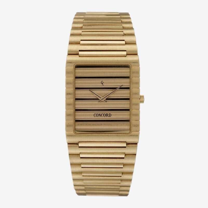 quartz movement, integral bracelet, graduated with foldover clasp.