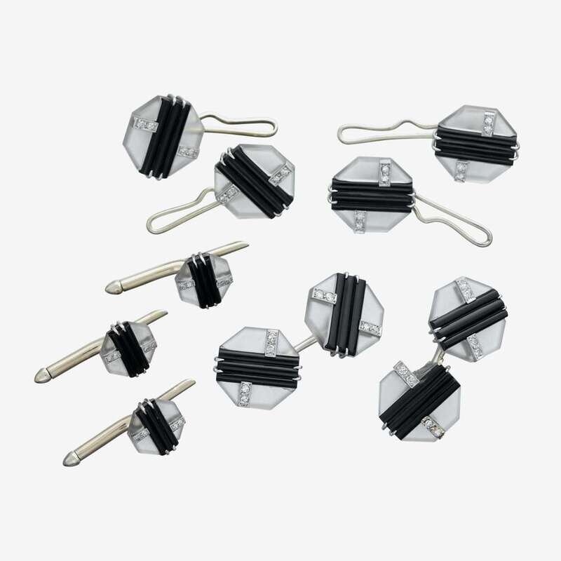 An Art Deco diamond, rock crystal, onyx and fourteen karat white gold dress set