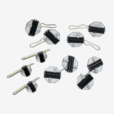 consisting of a pair of cufflinks, four buttons and three studs; octagonal frosted rock crystal centering ribbed onyx and accented by single-cut diamonds.