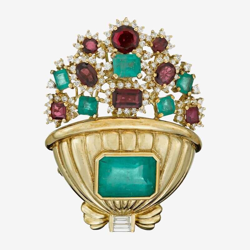 designed as a flower pot centering a step-cut emerald weighing approximately: 8.25 carats; with vari-cut emeralds and garnet flowers accented by baguette and full-cut diamonds; total diamond weight approximately: 1.35 carats.