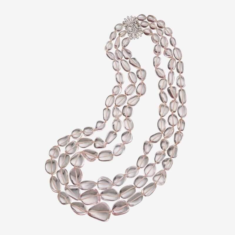 with three strands of graduated free-form polished morganite beads weighing approximately: 43.40 carats; and completed by a full and rose-cut diamond clasp; total diamond weight approximately: 1.05 carat.