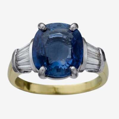 A sapphire, diamond, platinum and eighteen karat gold ring