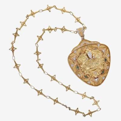 a large gold pendant featuring a repoussé face of a man centering a pear-shaped diamond weighing approximately: 1.50 carats; accented by textured gold, round brilliant-cut diamonds and emeralds; total remaining diamond weight approximately: 0.50 carat.