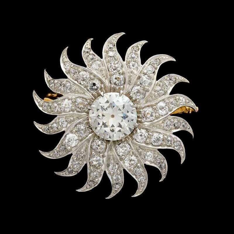 designed as a sunburst centering an old European-cut diamond weighing approximately: 1.95 carats; and set throughout with single and old mine-cut diamonds; total remaining diamond weight approximately: 1.55 carats. Accompanied by original removable brooch and pendant fittings.