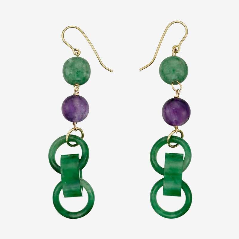 round jade and amethyst beads terminating in a carved jade triple loop.