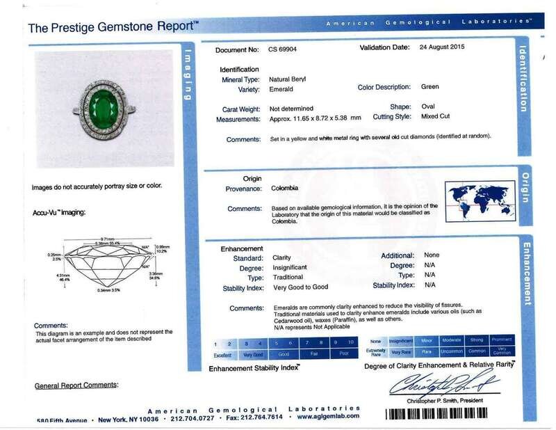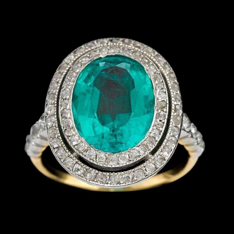 centering an oval-cut emerald weighing approximately: 3.15 carats; in an old single-cut diamond double surround; total diamond weight approximately: 0.65 carat.