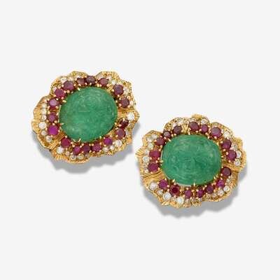 *A pair of emerald, ruby, diamond and eighteen karat gold ear-clips, Cartier Paris