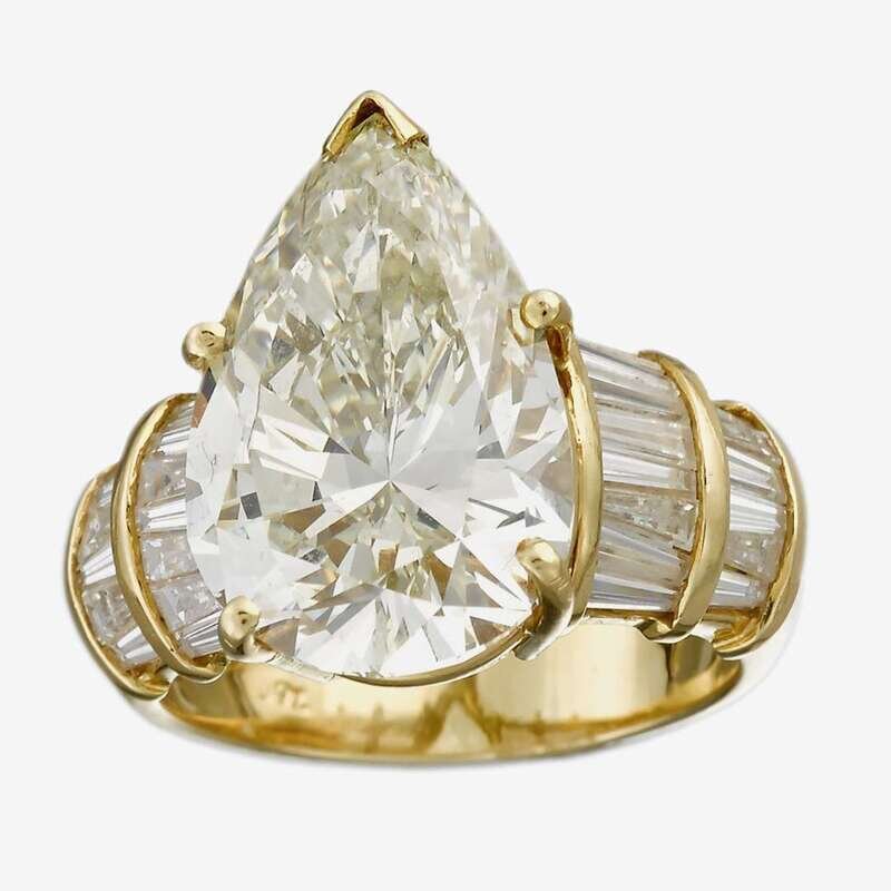 centering a pear-shaped yellow diamond weighing: 8.20 carats (diamond not tested for origin of color); flanked by two rows of channel-set baguette-cut diamonds; total remaining diamond weight approximately: 1.70 carats.