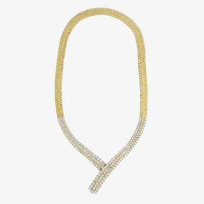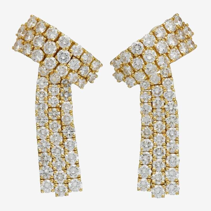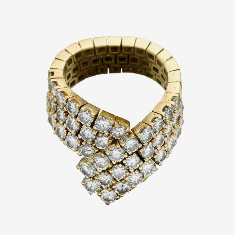 consisting of cross-over design necklace, ring and ear-clips; flexible ring and necklace set to the front with round brilliant-cut diamonds and completed with square brick links; earrings set with round brilliant-cut diamonds; total diamond weight approximately: 28.80 carats.