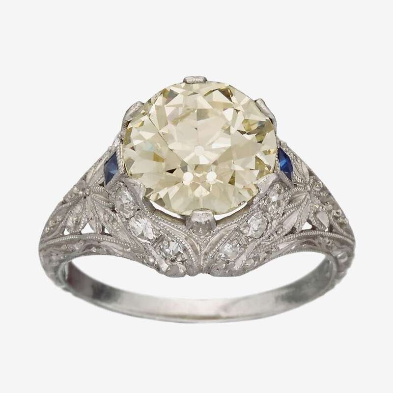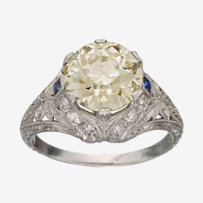 centering an old European-cut diamond weighing approximately: 3.25 carats; and in a pierced millegrain foliate motif mounting set with single and old European-cut diamonds accented by calibré-cut sapphire and synthetic sapphire.