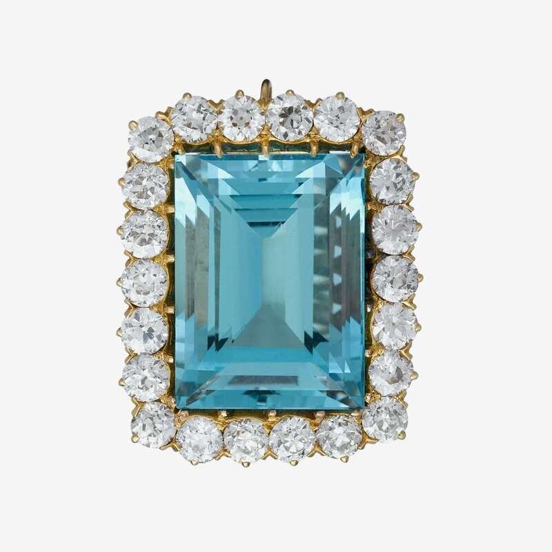 centering a step-cut aquamarine weighing approximately: 51.50 carats; in an old European-cut diamond surround; total diamond weight approximately: 8.50 carats.